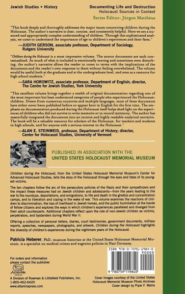 Children during the Holocaust, from the United States Holocaust Memorial Museum's Center for Advanced Holocaust Studies, tells the story of the Holocaust through the eyes, and fates, of its youngest victims. The ten chapters follow the arc of the persecutory policies of the Nazis and their sympathizers and the impact these measures had on Jewish children and adolescents-from the years leading to the war, to the roundups, deportations, and emigrations, to hidden life and death in the ghettos and concentration camps, and to liberation and coping in the wake of war. This volume examines the reactions of children to discrimination, the loss of livelihood in Jewish homes, and the public humiliation at the hands of fellow citizens and explores the ways in which children's experiences paralleled and diverged from their adult counterparts. Additional chapters reflect upon the role of non-Jewish children as victims, perpetrators, and bystanders during World War II. Offering a collection of personal letters, diaries, court testimonies, government documents, military reports, speeches, newspapers, photographs, and artwork, Children during the Holocaust highlights the diversity of children's experiences during the nightmare years of the Holocaust.