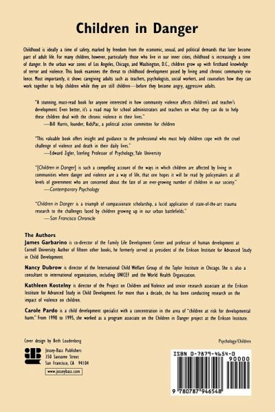 JAMES GARBARINO is co-director of the Family Life Development Center and professor of human development at Cornell University. Author of fifteen other books, he formerly served as president of the Erikson Institute for Advanced Study in Child Development. NANCY DUBROW is director of the International Child Welfare Group of the Taylor Institute in Chicago. She is also a consultant to international organizations, including UNICEF and the World Health Organization. KATHLEEN KOSTELNY is director of the Project on Children and Violence and senior research associate at the Erikson Institute for Advanced Study in Child Development. For more than a decade, she has been conducting research on the impact of violence on children. CAROLE PARDO is a child development specialist with a concentration in the area of "children at risk for developmental harm." From 1990 to 1995, she worked as a program associate on the Children in Danger project at the Erikson Institute.