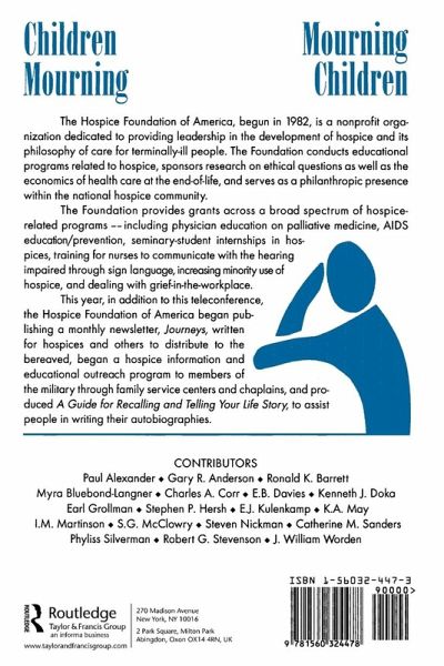 Based on the Hospice Foundation of America's second annual teleconference, this book explores three basic themes in children's grief. Firstly, it maintains that children are always developing; therefore their understanding of death and their reactions to illness and loss are also multifaceted and constantly undergoing change. Secondly, children grieve in ways that are both different from and similar to adults. While they may need different therapeutic approaches from their elders, each loss is different and the grief experience will be affected by many of the same factors that affect adults. Thirdly, it holds that they need significant support as they grieve.; Talking to children about loss and and illness is too important to wait until a crisis; rather, it is essential to provide opportunities to discuss loss in times that are not so Emotionally Laden. This Book Aims To Demonstrate That Open Communication between parents and children will lead to skills and understanding that are essential to the child for coping with loss and reaffirming that death is part of the process of living.