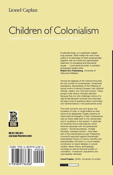 Among the legacies of the colonial encounter are any number of contemporary 'mixed-race' populations, descendants of the offspring of sexual unions involving European men (colonial officials, traders, etc.) and local women. These groups invite serious scholarly attention because they not only challenge notions of a rigid divide between colonizer and colonized, but beg a host of questions about continuities and transformations in the postcolonial world. This book concerns one such group, the Eurasians of India, or Anglo-Indians as they came to be designated. Caplan presents an historicized ethnography of their contemporary lives as these relate both to the colonial past and to conditions in the present. In particular, he forcefully shows that features which theorists associate with the postcolonial present - blurred boundaries, multiple identities, creolized cultures - have been part of the colonial past as well. Presenting a powerful argument against theoretically essentialized notions of culture, hybridity and postcoloniality, this book is a much-needed contribution to recent debates in cultural studies, literary theory, anthropology, sociology as well as historical studies of colonialism, 'mixed-race' populations and cosmopolitan identities.