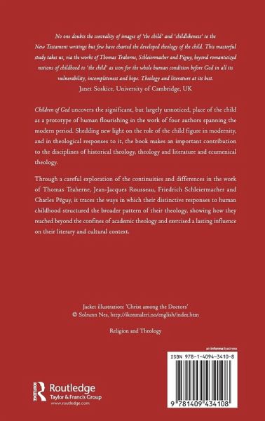 Children of God uncovers the significant, but largely unnoticed, place of the child as a prototype of human flourishing in the work of four authors spanning the modern period. Shedding new light on the role of the child figure in modernity, and in theological responses to it, the book makes an important contribution to the disciplines of historical theology, theology and literature and ecumenical theology. Through a careful exploration of the continuities and differences in the work of Thomas Traherne, Jean-Jacques Rousseau, Friedrich Schleiermacher and Charles Péguy, it traces the ways in which their distinctive responses to human childhood structured the broader pattern of their theology, showing how they reached beyond the confines of academic theology and exercised a lasting influence on their literary and cultural context.