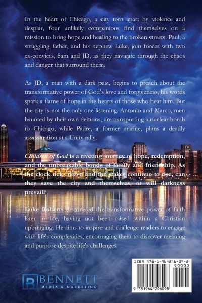 In the heart of Chicago, a city torn apart by violence and despair, four unlikely companions find themselves on a mission to bring hope and healing to the broken streets. Paul, a struggling father, and his nephew Luke, join forces with two ex-convicts, Sam and JD, as they navigate through the chaos and danger that surround them. As JD, a man with a dark past, begins to preach about the transformative power of God's love and forgiveness, his words spark a flame of hope in the hearts of those who hear him. But the city is not the only one listening. Antonio and Marco, men haunted by their own demons, are transporting a nuclear bomb to Chicago, while Padre, a former marine, plans a deadly assassination at a Unity rally. Children of God is a riveting journey of hope, redemption, and the unbreakable bonds of family and friendship. As the clock ticks down and the stakes continue to rise, can they save the city and themselves, or will darkness prevail?