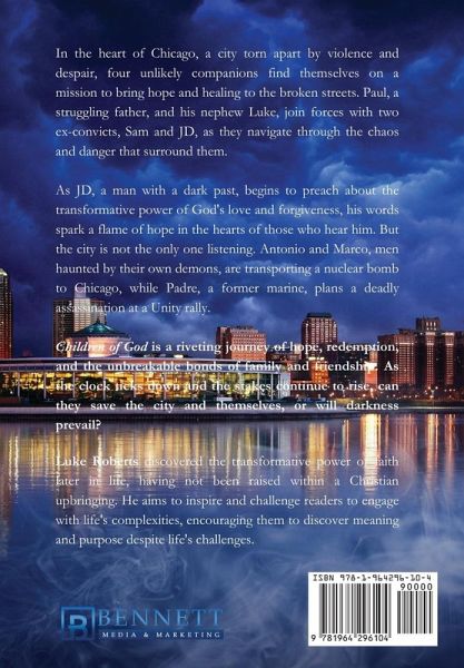 In the heart of Chicago, a city torn apart by violence and despair, four unlikely companions find themselves on a mission to bring hope and healing to the broken streets. Paul, a struggling father, and his nephew Luke, join forces with two ex-convicts, Sam and JD, as they navigate through the chaos and danger that surround them. As JD, a man with a dark past, begins to preach about the transformative power of God's love and forgiveness, his words spark a flame of hope in the hearts of those who hear him. But the city is not the only one listening. Antonio and Marco, men haunted by their own demons, are transporting a nuclear bomb to Chicago, while Padre, a former marine, plans a deadly assassination at a Unity rally. Children of God is a riveting journey of hope, redemption, and the unbreakable bonds of family and friendship. As the clock ticks down and the stakes continue to rise, can they save the city and themselves, or will darkness prevail?