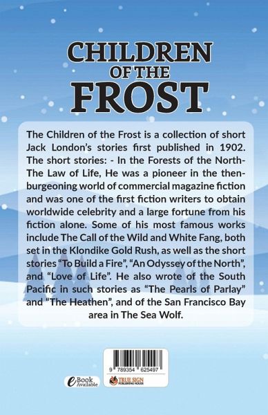 The Children of the Frost is a collection of short Jack London's stories first published in 1902.The short stories: - In the Forests of the North- The Law of Life, He was a pioneer in the then-burgeoning world of commercial magazine fiction and was one of the first fiction writers to obtain worldwide celebrity and a large fortune from his fiction alone. Some of his most famous works include The Call of the Wild and White Fang, both set in the Klondike Gold Rush, as well as the short stories "To Build a Fire", "An Odyssey of the North", and "Love of Life". He also wrote of the South Pacific in such stories as "The Pearls of Parlay" and "The Heathen", and of the San Francisco Bay area in The Sea Wolf.