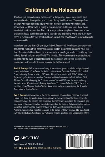 This important reference work highlights a number of disparate themes relating to the experience of children during the Holocaust, showing their vulnerability and how some heroic people sought to save their lives amid the horrors perpetrated by the Nazi regime. This book is a comprehensive examination of the people, ideas, movements, and events related to the experience of children during the Holocaust. They range from children who kept diaries to adults who left memoirs to others who risked (and, sometimes, lost) their lives in trying to rescue Jewish children or spirit them away to safety in various countries. The book also provides examples of the nature of the challenges faced by children during the years before and during World War II. In many cases, it examines the very act of children's survival and how this was achieved despite enormous odds. In addition to more than 125 entries, this book features 10 illuminating primary source documents, ranging from personal accounts to Nazi statements regarding what the fate of Jewish children should be to statements from refugee leaders considering how to help Jewish children after World War II ended. These documents offer fascinating insights into the lives of students during the Holocaust and provide students and researchers with excellent source material for further research.