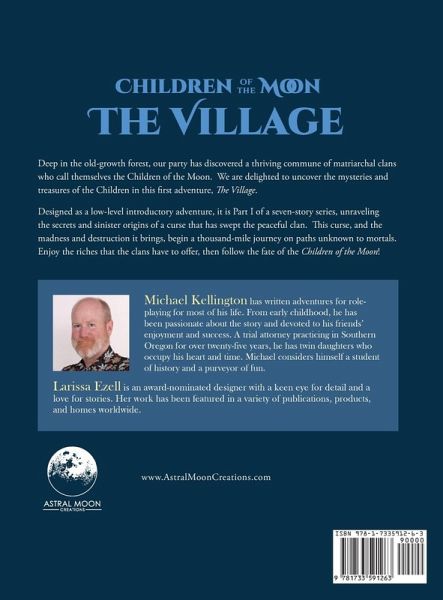Deep in the old-growth forest, our party has discovered a thriving commune of matriarchal clans who call themselves the Children of the Moon. We are delighted to uncover the mysteries and treasures of the Children in this first adventure, The Village. Designed as a low-level introductory adventure, it is Part I of a seven-story series, unraveling the secrets and sinister origins of a curse that has swept the peaceful clan. This curse, and the madness and destruction it brings, begin a thousand-mile journey on paths unknown to mortals. Enjoy the riches that the clans have to offer, then follow the fate of the Children of the Moon!