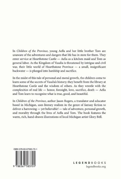 In Children of the Province, young Aella and her little brother Tom are unaware of the adventures and dangers that life has in store for them. They enter service at Hearthstone Castle - Aella as a kitchen maid and Tom as general labor. As the Kingdom of Vasalia is threatened by intrigue and civil war, their little world of Hearthstone Province - a small, insignificant backwater - is plunged into hardship and sacrifice. In the midst of this tale of personal and moral growth, the children come to learn some of the secrets of Vasalia's history; they benefit from the library at Hearthstone Castle and the wisdom of others. As they wrestle with the complexities of real life - honor, foresight, love, sacrifice, death - Aella and Tom learn to recognize what is true, good, and beautiful. In Children of the Province, author Jason Rogers, a translator and educator based in Michigan, uses literary realism in the genre of fantasy fiction to deliver a harrowing - yet believable! - tale of adventure, personal growth, and morality through the lives of Aella and Tom. The book features the warm, rich, hand-drawn illustrations of local Michigan artist Glory Bell.