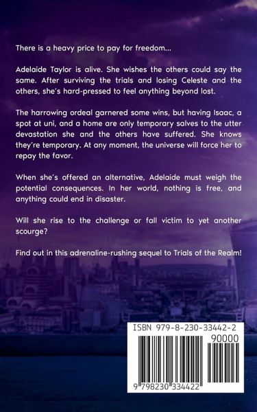 There is a heavy price to pay for freedom... Adelaide Taylor is alive. She wishes the others could say the same. After surviving the trials and losing Celeste and the others, she's hard-pressed to feel anything beyond lost. The harrowing ordeal garnered some wins, but having Isaac, a spot at uni, and a home are only temporary salves to the utter devastation she and the others have suffered. She knows they're temporary. At any moment, the universe will force her to repay the favor. When she's offered an alternative, Adelaide must weigh the potential consequences. In her world, nothing is free, and anything could end in disaster. Will she rise to the challenge or fall victim to yet another scourge? Find out in this adrenaline-rushing sequel to Trials of the Realm!