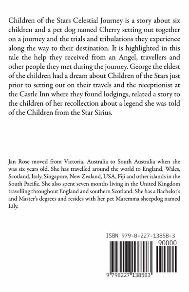 Children of the Stars Celestial Journey is a story about six children and a pet dog named Cherry setting out together on a journey and the trials and tribulations they experience along the way to their destination. It is highlighted in this tale the help they received from an Angel, travellers and other people they met during the journey. George the eldest of the children had a dream about Children of the Stars just prior to setting out on their travels and the receptionist at the Castle Inn where they found lodgings, related a story to the children of her recollection about a legend she was told of the Children from the Star Sirius.