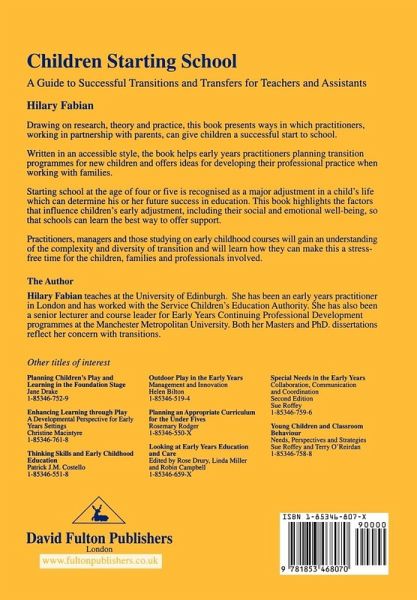 Drawing on research, theory and practice, this book presents ways in which practitioners, working in partnership with parents, can give children a successful start to school. Written in an accessible style, the book helps early years practitioners planning transition programs for new children and offers ideas for developing their professional practice when working with families. Starting school at the age of four or five is recognized as a major adjustment in a child's life that can determine his or her future success in education. This book highlights the factors that influence children's early adjustment, including their social and emotional wellbeing, so that schools can learn the best way to offer support. Practitioners, managers and those studying on early childhood courses will gain an understanding of the complexity and diversity of transition and will learn how they can make this a stress-free time for the children, families and professionals involved.