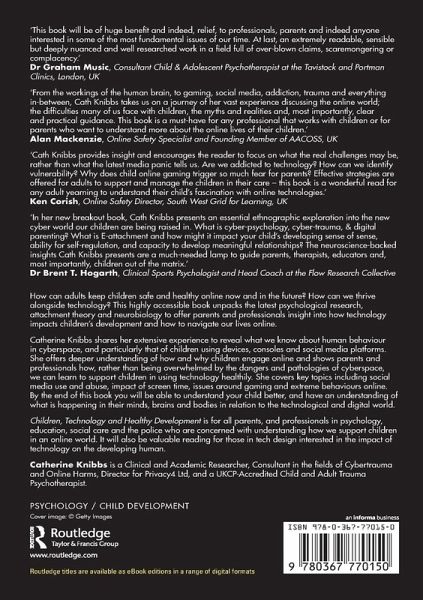 Catherine Knibbs shares her extensive experience to reveal what we know about human behaviour in cyberspace, and particularly that of children using devices, consoles and social media platforms. She offers deeper understanding of how and why children engage online and shows parents and professionals how, rather than being overwhelmed by the dangers and pathologies of cyberspace, we can learn to support children in using technology healthily. She covers key topics including social media use and abuse, impact of screen time, issues around gaming and extreme behaviours online. By the end of this book you will be able to understand your child better, and have an understanding of what is happening in their minds, brains and bodies in relation to the technological and digital world.
