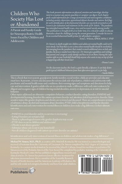 This is a book that every parent, grandparent, family member, social worker, childcare provider and educator must have. It presents, reviews and discusses the serious dark side of pediatrics, children and adolescents with psychiatric and mental health issues and conditions, their warning signs and symptoms and directions for help, care and intervention. It guides adults who are in a position to make a difference with early intervention to be diligent and recognize signs of children having mental disorders, anxiety or depression, or at risk for suicidal behavior. Other topics addressed are obsessive-compulsive behavior, conduct disorder, eating disorders, PANDAS and developmental learning disorders like autism spectrum disorder and attention deficit hyperactive disorder. More sensitive topics like gender dysphoria and obesity are reviewed and discussed. There are comprehensive reviews of substance abuse, alcohol and marijuana abuse disorders, PTSD, child schizophrenia and bipolar disorder. Identification and early intervention for mental illness in children does make a big difference in their ultimate outcome. * PANDAS is a real disorder and its occurrence is increasing! * Eating Disorders are not just a fad! * There is a physiological reason why gender dysphoria may occur! * PTSD does occur in children and adolescents! * Obesity is not always genetic! * Substance abuse can occur in any household! * Not all children diagnosed with autism spectrum disorder are autistic! * Identification and early intervention of mental illness in children and adolescents makes a big difference!