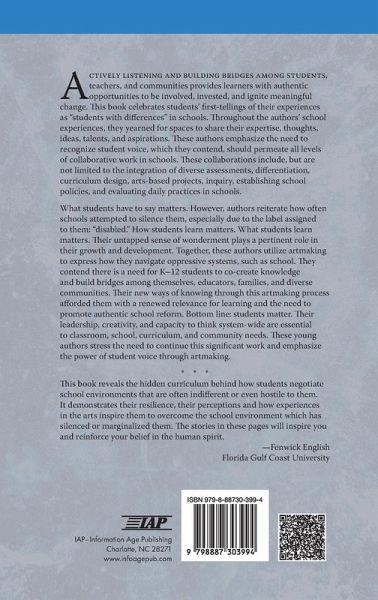 Actively listening and building bridges among students, teachers, and communities provides learners with authentic opportunities to be involved, invested, and ignite meaningful change. This book celebrates students' first-tellings of their experiences as "students with differences" in schools. Throughout the authors' school experiences, they yearned for spaces to share their expertise, thoughts, ideas, talents, and aspirations. These authors emphasize the need to recognize student voice, which they contend, should permeate all levels of collaborative work in schools. These collaborations include, but are not limited to the integration of diverse assessments, differentiation, curriculum design, arts-based projects, inquiry, establishing school policies, and evaluating daily practices in schools. What students have to say matters. However, authors reiterate how often schools attempted to silence them, especially due to the label assigned to them: "disabled." How students learn matters. What students learn matters. Their untapped sense of wonderment plays a pertinent role in their growth and development. Together, these authors utilize artmaking to express how they navigate oppressive systems, such as school. They contend there is a need for K-12 students to co-create knowledge and build bridges among themselves, educators, families, and diverse communities. Their new ways of knowing through this artmaking process afforded them with a renewed relevance for learning and the need to promote authentic school reform. Bottom line: students matter. Their leadership, creativity, and capacity to think system-wide are essential to classroom, school, curriculum, and community needs. These young authors stress the need to continue this significant work and emphasize the power of student voice through artmaking.