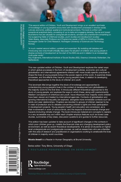 This landmark title brings together the stock of knowledge and approaches to understanding young people's lives in the context of development and globalization in the majority world for the first time. It introduces different theoretical approaches to the study of young people, and explores the ways in which these, along with predominantly Western conceptions of childhood and youth, have influenced how majority world children have been viewed and treated by international agencies. Contexts of globalisation and growing international inequality are explored, alongside more immediate contexts such as family and peer relationships. Chapters are devoted to groups of children deemed to be in need of protection and to debates concerning children's rights and their participation in development projects. Young people's health and education are considered, as is their involvement in work of various kinds, and the impacts of environmental change and hazards (including climate change). The book introduces material and concepts to readers in a very accessible way and within each chapter employs features such as boxed case studies, summaries of key ideas, discussion questions and guides to further resources.
