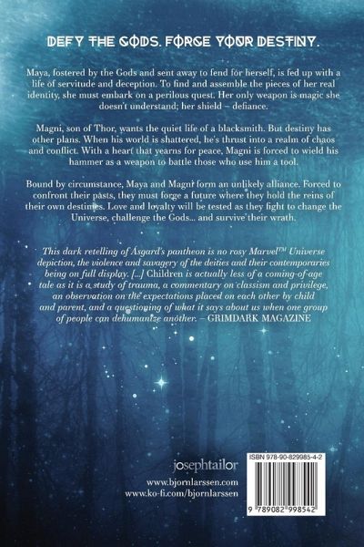 Defy the Gods. Forge your destiny. Maya, fostered by the Gods and sent away to fend for herself, is fed up with a life of servitude and deception. To find and assemble the pieces of her real identity, she must embark on a perilous quest. Her only weapon is magic she doesn't understand; her shield - defiance. Magni, son of Thor, wants the quiet life of a blacksmith. But destiny has other plans. When his world is shattered, he's thrust into a realm of chaos and conflict. With a heart that yearns for peace, Magni is forced to wield his hammer as a weapon to battle those who use him as a tool. Bound by circumstance, Maya and Magni form an unlikely alliance. Forced to confront their pasts, they must forge a future where they hold the reins of their own destinies. Love and loyalty will be tested as they fight to change the Universe, challenge the Gods... and survive their wrath. 2020 Stabby Nominee - Best Self-Published/Independent Novel 2022 Queer Indie Lit Award 2022 Picky Bookworm Award - Best Worldbuilding "The main thing which struck me was how different it was. Completely unlike the mainstream trad published fantasy. Then I went off and had a little cry." - Tim Hardie, author of Hall of Bones and A Quiet Vengeance "A haunting, brutal, and emotional coming of age story, steeped in Norse mythology and written in spare but lyrical prose, Children is a book that demands to be felt rather than read. Its hard-hitting story and dark humor combine to make this a grim book with lots of heart, a book that will stick with me for a long time." - Angela Boord, author of Fortune's Fool "Faced with gods who are interested only in their own goals, happy to use their own children to further their ambition in the face of a foretold end, Children can be read as allegory or fantasy. Drawing on established Norse myths but adding a unique interpretation, Larssen's tale made me wince with witnessed pain, and cry, and, once or twice, snort with laughter. His evocative prose will linger in my mind for a long time. Not a book easily forgotten." - Marian L Thorpe, author of Empress & Soldier and Empire's Daughter "This dark retelling of Asgard's pantheon is no rosy Marvel Universe depiction, the violence and savagery of the deities and their contemporaries being on full display. [...] Children is as actually less of a coming-of-age tale as it is a study of trauma, a commentary on classism and privilege, an observation on the expectations placed on each other by child and parent, and a questioning of what it says about us when one group of people can dehumanize another." - Grimdark Magazine Note: British English conventions, spelling, and grammar were used in this book. The book includes strong language, depictions of sexual, physical, and emotional violence. For full list of triggers, which may contain spoilers, see: https://www.bjornlarssen.com/children-tw