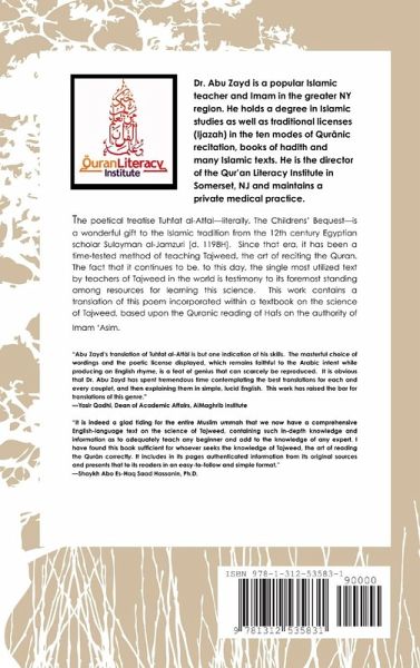 The poetical treatise Tüfat al-A¿f¿l-literally, The Childrens' Bequest-is a wonderful gift to the Islamic tradition from the 12th century Egyptian scholar Sulaym¿n al-Jamz¿r¿ [d. 1198H]. Since that era, it has been a time-tested method of teaching Tajweed, the art of reciting the Qur¿¿n. The fact that it continues to be, to this day, the single most utilized text by teachers of Tajweed in the world is testimony to its foremost standing among resources for learning this science. This work contains a translation of this poem incorporated within a textbook on the science of Tajweed, based upon the Qur¿¿nic reading of ¿af¿ on the authority of Im¿m '¿¿im.