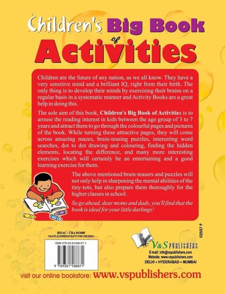 Children are the future of any nation, as we all know. They have a very sensitive mind and a brilliant IQ, right from their birth. The only thing is to develop their minds by exercising their brains on a regular basis in a systematic manner and Activity Books are a great help in doing this. The sole aim of this book, Children's Big Book of Activities is to arouse the reading interest in kids between the age group of 3 to 7 years and attract them to go through the colourful pages and pictures of the book. While turning these attractive pages, they will come across amazing mazes, brain-teasing puzzles, interesting word searches, dot to dot drawing and colouring, finding the hidden elements, locating the difference, and many more interesting exercises which will certainly be an entertaining and a good learning exercise for them. The above mentioned brain-teasers and puzzles will not only help in sharpening the mental abilities of the tiny-tots, but also prepare them thoroughly for the higher classes in school. So go ahead, dear moms and dads, you'll find that the book is ideal for your little darlings!