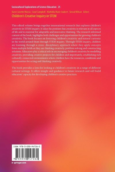This edited volume brings together international research that explores children's creativity in STEM inquiry. It takes the position that creativity is relevant in all aspects of life and is essential for adaptable and innovative thinking. The research informed content of the book, highlights both challenges and opportunities for growing children's creativity. The book focuses on fostering children's creativity and natural curiosity in the world around them through STEM inquiry. Through STEM inquiry, children are learning through a cross- disciplinary approach where they apply concepts from multiple fields as they are thinking creatively, problem solving and constructing solutions. Educators play a critical role in encouraging children's creativity by modelling creativity, providing creative projects for children and importantly, establishing rich culturally connected environments where children have the resources, conditions and opportunities for acting and thinking creatively. The book provides a lens for looking at children's creativity in a range of different cultural settings. It offers insight and guidance to future research and will build educators' capacity for developing children's creative practices.
