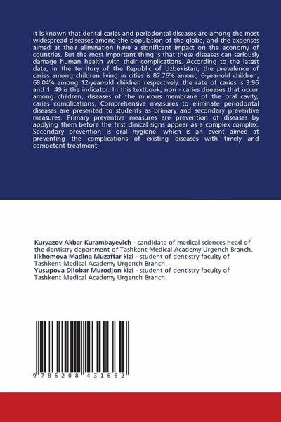 It is known that dental caries and periodontal diseases are among the most widespread diseases among the population of the globe, and the expenses aimed at their elimination have a significant impact on the economy of countries. But the most important thing is that these diseases can seriously damage human health with their complications. According to the latest data, in the territory of the Republic of Uzbekistan, the prevalence of caries among children living in cities is 87.76% among 6-year-old children, 68.04% among 12-year-old children respectively, the rate of caries is 3.96 and 1 .49 is the indicator. In this textbook, non - caries diseases that occur among children, diseases of the mucous membrane of the oral cavity, caries complications, Comprehensive measures to eliminate periodontal diseases are presented to students as primary and secondary preventive measures. Primary preventive measures are prevention of diseases by applying them before the first clinical signs appear as a complex complex. Secondary prevention is oral hygiene, which is an event aimed at preventing the complications of existing diseases with timely and competent treatment.