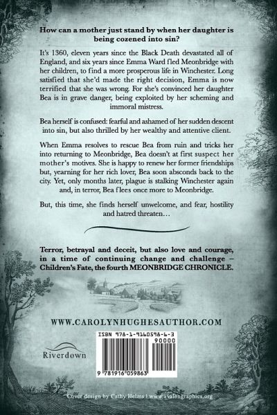How can a mother just stand by when her daughter is being cozened into sin? It's 1360, eleven years since the Black Death devastated all of England, and six years since Emma Ward fled Meonbridge with her children, to find a more prosperous life in Winchester. Long satisfied that she'd made the right decision, Emma is now terrified that she was wrong. For she's convinced her daughter Bea is in grave danger, being exploited by her scheming and immoral mistress. Bea herself is confused: fearful and ashamed of her sudden descent into sin, but also thrilled by her wealthy and attentive client. When Emma resolves to rescue Bea from ruin and tricks her into returning to Meonbridge, Bea doesn't at first suspect her mother's motives. She is happy to renew her former friendships but, yearning for her rich lover, Bea soon absconds back to the city. Yet, only months later, plague is stalking Winchester again and, in terror, Bea flees once more to Meonbridge. But, this time, she finds herself unwelcome, and fear, hostility and hatred threaten... Terror, betrayal and deceit, but also love and courage, in a time of continuing change and challenge - Children's Fate, the fourth MEONBRIDGE CHRONICLE.
