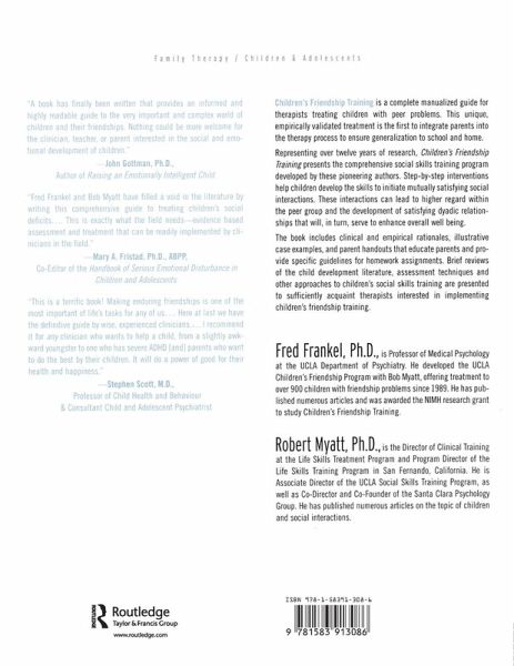 Fred Frankel is Professor of Medical Psychology, UCLA Department of Psychiatry. He developed the UCLA Children's Friendship Training Program with Robert Myatt, offering treatment to over 900 children with friendship problems since 1989. He has published several controlled studies and was awarded an NIMH research grant to study Children's Friendship Training.