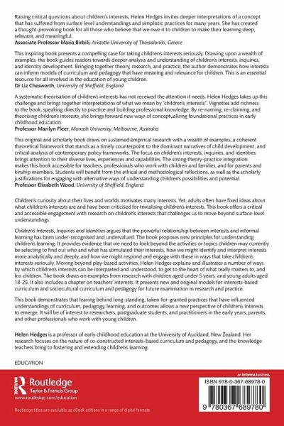 This inspiring book presents a compelling case for taking children's interests seriously. Drawing upon a wealth of examples, the book guides readers towards deeper analysis and understanding of children's interests, inquiries, and identity development. Bringing together theory, research, and practice, the author demonstrates how interests can inform models of curriculum and pedagogy that have meaning and relevance for children. This is an essential resource for all involved in the education of young children.