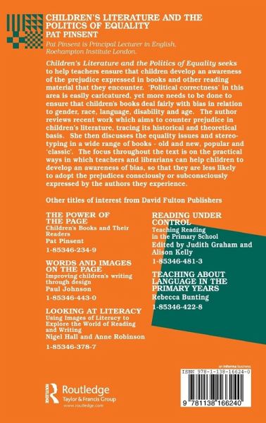 First published in 1997. In this book the author intends to explore some of the many questions which arise as a result of increasing awareness in our society about equality issues. Can the attempt to make books for children consistent with contemporary views about equality go too far? In any case, are children really as much influenced by books and other material as some educationalists would claim? What can or should we do about the 'classics' Of the past? And are today's children's writers so much better at avoiding giving offence to minorities? How much are children affected by the kind of prejudices and preconceptions that we all grow up with but don't always succeed in acknowledging in later life?