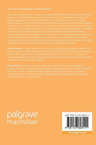 This book provides scholars, both national and international, with a basis for advanced research in children's literature in collections. Examining books for children published across five centuries, gathered from the collections in Dublin, this unique volume advances causes in collecting, librarianship, education, and children's literature studies more generally. It facilitates processes of discovery and recovery that present various pathways for researchers with diverse interests in children's books to engage with collections. From book histories, through bookselling, information on collectors, and histories of education to close text analyses, it is evident that there are various approaches to researching collections. In this volume, three dominant approaches emerge: history and canonicity, author and text, ideals and institutions. Through its focus on varied materials, from fiction to textbooks, this volume illuminates how cities can articulate a vision of children's literature through particular collections and institutional practices.