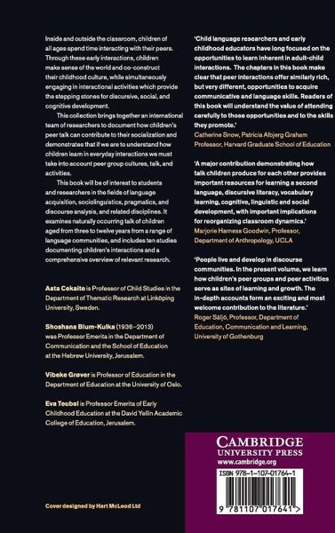 Inside and outside the classroom, children of all ages spend time interacting with their peers. Through these early interactions, children make sense of the world and co-construct their childhood culture, while simultaneously engaging in interactional activities which provide the stepping stones for discursive, social and cognitive development. This collection brings together an international team of researchers to document how children's peer talk can contribute to their socialization and demonstrates that if we are to understand how children learn in everyday interactions we must take into account peer group cultures, talk, and activities. This book will be of interest to students and researchers in the fields of language acquisition, sociolinguistics, pragmatics and discourse analysis, and related disciplines. It examines naturally occurring talk of children aged from three to twelve years from a range of language communities, and includes ten studies documenting children's interactions and a comprehensive overview of relevant research.