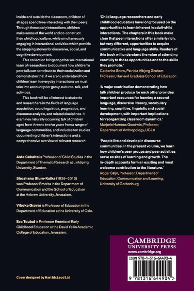Inside and outside the classroom, children of all ages spend time interacting with their peers. Through these early interactions, children make sense of the world and co-construct their childhood culture, while simultaneously engaging in interactional activities which provide the stepping stones for discursive, social and cognitive development. This collection brings together an international team of researchers to document how children's peer talk can contribute to their socialization and demonstrates that if we are to understand how children learn in everyday interactions we must take into account peer group cultures, talk, and activities. This book will be of interest to students and researchers in the fields of language acquisition, sociolinguistics, pragmatics and discourse analysis, and related disciplines. It examines naturally occurring talk of children aged from three to twelve years from a range of language communities, and includes ten studies documenting children's interactions and a comprehensive overview of relevant research.