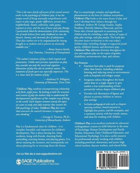 `Enlivened with illustrations and case studies, this book gives an exceptionally readable account of the development of children's play from infancy through to adolescence. It also branches out to include humour, sports, and modern developments in electronic games, as well as uses of play in therapy. It will be a great resource for practitioners and play workers, and indeed for parents who wish to be informed of current thinking and research' - Peter K Smith, Goldsmiths College, University of London `George Scarlett and colleagues' treatment of play is both original and provocative. Unlike most previous expositions on play, they consider not only the social and cognitive dimensions of play but also its aesthetic nature. The treatment of youth sport was especially impressive. This is a "must read" for students of play' - Anthony D Pellegrini, Professor Department of Educational Psychology, University of Minnesota- Twin Cities Campus `This is the most clearly self aware of the several current works in the psychology of children's play. It has the unique worth of being unusually comprehensive with respect to play stages, gender differences, private lives, neighborhoods, humour, collections, video games, responses to stress and the uses of recess and play therapy. I particularly liked the demonstration of the continuing role of make believe from early childhood on into the theatric, literary and electronic foci of adolescence. These four authors are to be congratulated for having brought us as students and as parents an unusually readable text' - Brian Sutton-Smith, Professor Emeritus, University of Pennsylvania Children's Play combines uncompromising scholarship with fresh, joyful prose. By looking at both the structure and content of play the authors help us understand the developmental significance of this complex way of being in the world. Each chapter contains exactly the topics we want to study and adds surprises that counter the folk-psychology of today. Children's Play does more than overview the research literature; it engenders new thinking' - George E Forman, Emeritus Professor, Child and Family Studies, University of Massachusetts, Amherst, Massachusetts Play is a surprisingly complex and significant phenomenon in the lives of children everywhere. Children's Play looks at the many facets of play and how it develops from infancy through late childhood. Authors W George Scarlett, Sophie Naudeau, Dorothy Salonius-Pasternak, and Iris Ponte take a broad approach to examining how children play by including a wide variety of types of play, play settings, and play media. The book also discusses major revolutions in the way today's children play, including changes in organized youth sports, children's humour, and electronic play. Children's Play addresses diversity throughout the book and explores play on the topics of gender, disabilities, socioeconomic class, and culture. Features: } broad scope. Covers various age groups from infancy through pre-adolescence and includes topics often missing from books on children's play, e.g, restorative play. } discussion of current revolutions in play. Provides full coverage of topics such as electronic play and organized youth sports. } treatment of culture. Rather than segregate culture into a single chapter, culture and diversity issues run throughout the book to give students a deep understanding of how pervasively culture shapes children's play. Discussions include considerations of age changes in how children play, gender differences, socioeconomic class differences, differences based on disabilities, cultural differences, and typical versus atypical settings and environments. } helpful pedagogy. To assist student study, chapters include chapter-opening outlines, boxed material to amplify key points with memorable real-life examples, a socratic style that punctuates the text by posing new topics in the form of questions to be explored, a summary section along with a list of key words, names, and ideas, and a rich illustration program with figures and photos of children in various play settings.