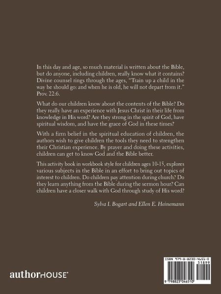 In this day and age, so much material is written about the Bible, but do anyone, including children, really know what it contains? Divine counsel rings through the ages, "Train up a child in the way he should go: and when he is old, he will not depart from it." Prov. 22:6. What do our children know about the contents of the Bible? Do they really have an experience with Jesus Christ in their life from knowledge in His word? Are they strong in the spirit of God, have spiritual wisdom, and have the grace of God in these times? With a firm belief in the spiritual education of children, the authors wish to give children the tools they need to strengthen their Christian experience. By prayer and doing these activities, children can get to know God and the Bible better. This activity book in workbook style for children ages 10-15, explores various subjects in the Bible in an effort to bring out topics of interest to children. Do children pay attention during church? Do they learn anything from the Bible during the sermon hour? Can children have a closer walk with God through study of His word? Sylva I. Bogart and Ellen E. Heinemann