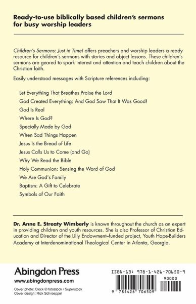 Ready-to-use biblically based children's sermons for busy worship leaders. Children's Sermons Just in Time! offers preachers and worship leaders a ready resource for children's sermons with stories and object lessons. These children's sermons are geared to spark interest and attention and teach children about the Christian faith. - 54 easy-to- understand messages with Scripture references including: Let Everything that Breathes Praise the Lord God Created Everything: And God Saw It Was Good God is Read Where is God? Specially Made by God When Sad Things Happen Jesus is the Bread of Life Jesus Call Us to Come (and Go) Why We Read the Bible Holy Cummunion We are God's Family Bethlehem Bakery Baptism: A Gift from God Talking to God - Themed sermons for all seasons including: Valentine's Day WOW for Moms Living What We Learn Blessing for Father's Day What God Wants A Cloud of Witnesses Doxology for Thanksgiving Build up the Body of Christ for Easter A Highway for God for Advent