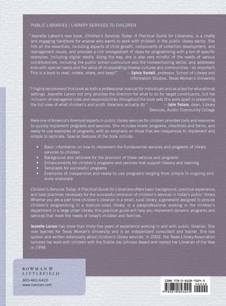 Here, one of America's foremost experts in public library services to children cover the basics of library services for children. Jeanette Larson highlights best practices and "toolkits" that provide tools and resources to quickly implement programs and services. Children's Services Today: A Practical Guide for Librarians offers basic background, practical experience, and best practices necessary for the successful provision of children's services in today's public library. Whether you are a part-time children's librarian in a small, rural library, a generalist assigned to provide children's programming in a medium-sized library, or a paraprofessional working in the children's department in a large urban library, this practical guide will help you implement dynamic programs and services that meet the needs of today's children and families