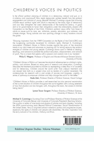 Is the official political silencing of children in a democracy rational and just, or is it arbitrary and capricious? How might democratic polities benefit from the political engagement and activism of young people? Michael Cummings argues that allowing children equal political rights with adults is required by the basic logic of democracy and can help strengthen the weak democracies of the twenty-first century. A good start is for governments to honor their obligations under the ambivalently utopian UN Convention on the Rights of the Child. Children's political views differ from those of adults on issues such as race, sex, militarism, poverty, education, gun violence, and climate change. Young activists are now sparking change in many locations around the globe.