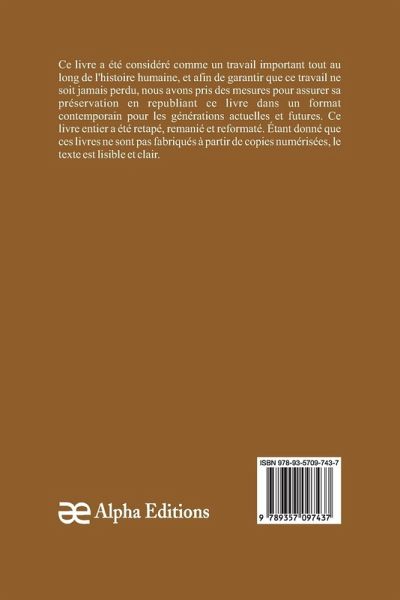 Childéric, Roi des Francs, (tome premier), a été considérée comme importante tout au long de l'histoire de l'humanité. Dans un effort pour s'assurer que ce travail ne soit jamais perdu, nous avons pris des mesures pour assurer sa préservation en republiant ce livre dans un format moderne pour les générations actuelles et futures. Ce livre complet a été retapé, remanié et reformaté. Comme ces livres ne sont pas des scans des publications originales des auteurs, le texte est lisible et clair.