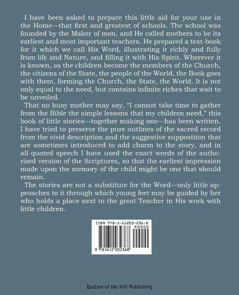 I have been asked to prepare this little aid for your use in the Home-that first and greatest of schools. The school was founded by the Maker of men, and He called mothers to be its earliest and most important teachers. He prepared a text-book for it which we call His Word, illustrating it richly and fully from life and Nature, and filling it with His Spirit. Wherever it is known, as the children become the members of the Church, the citizens of the State, the people of the World, the Book goes with them, forming the Church, the State, the World. It is not only equal to the need, but contains infinite riches that wait to be unveiled. That no busy mother may say, "I cannot take time to gather from the Bible the simple lessons that my children need," this book of little stories-together making one-has been written. I have tried to preserve the pure outlines of the sacred record from the vivid description and the suggestive supposition that are sometimes introduced to add charm to the story, and in all quoted speech I have used the exact words of the authorized version of the Scriptures, so that the earliest impression made upon the memory of the child might be one that should remain. The stories are not a substitute for the Word-only little approaches to it through which young feet may be guided by her who holds a place next to the great Teacher in His work with little children.