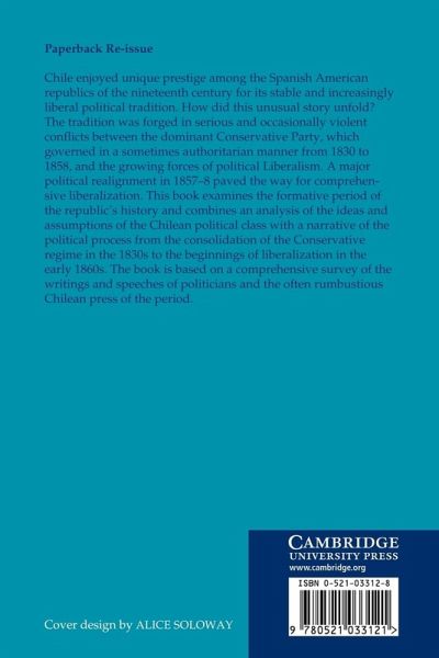 Chile enjoyed unique prestige among the Spanish American republics of the nineteenth century for its stable and increasingly liberal political tradition. How did this unusual story unfold? The tradition was forged in serious and occasionally violent conflicts between the dominant Conservative Party, which governed in an often authoritarian manner from 1830 to 1858, and the growing forces of political Liberalism. A major political realignment in 1857–8 paved the way for comprehensive liberalization. This book examines the formative period of the republic's history and combines an analysis of the ideas and assumptions of the Chilean political class with a narrative of the political process from the consolidation of the Conservative regime in the 1830s, to the beginnings of liberalization in the early 1860s. The book is based on a comprehensive survey of the writings and speeches of politicians and the often rumbustious Chilean press of the period.