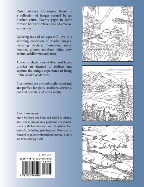 Chill Alaska Coloring Book is a collection of fine-line Alaska images to color for relaxation or just for fun. Original and beautifully detailed designs feature Alaska salmon, glaciers, mountains, rocky beaches, northern lights, cozy cabins, wildflowers, and more. Twenty single-sided pages to color with pens, markers, colored pencils, or the medium of your choice. Two copies each of ten images means you can try different color combinations, or keep one and share one. Perfect gift to share the beauty of Alaska or remember the stunning scenery from your trip of a lifetime.