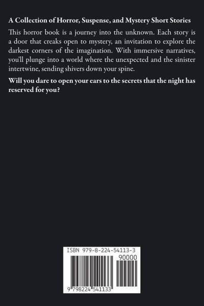 A Collection of Horror, Suspense, and Mystery Short Stories This horror book is a journey into the unknown. Each story is a door that creaks open to mystery, an invitation to explore the darkest corners of the imagination. With immersive narratives, you'll plunge into a world where the unexpected and the sinister intertwine, sending shivers down your spine. Will you dare to open your ears to the secrets that the night has reserved for you?
