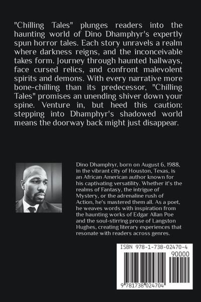 Dive into "Chilling Tales" by Dino Dhamphyr—a haunting collection of horror stories that masterfully blend terror, suspense, and the macabre into an unforgettable reading experience. Each story is a dark journey into a world where nightmares are not just figments of the imagination, but tangible fears lurking in the shadows. What Lies Within?Haunted houses with secrets yearning to be unearthed. Cursed objects with a life of their own, wielding unimaginable powers. Vengeful spirits that don't rest until they claim their due. Demonic entities that defy the boundaries between our world and the unknown. As you turn each page, prepare for your pulse to quicken, your breaths to shorten, and your grip to tighten. Dino Dhamphyr crafts each tale with a compelling narrative and vivid imagery that will immerate you in a world you'll wish you could escape from—but will be too captivated to leave. Reader Beware: This collection is not for the faint of heart. "Chilling Tales" will keep you on the edge of your seat, holding your breath until the very last word. Once you enter Dino Dhamphyr's spine-tingling world of horror, there's no turning back. Satisfy your craving for the terrifying and the dark. Enter if you dare, but be warned—you may never see the world the same way again.