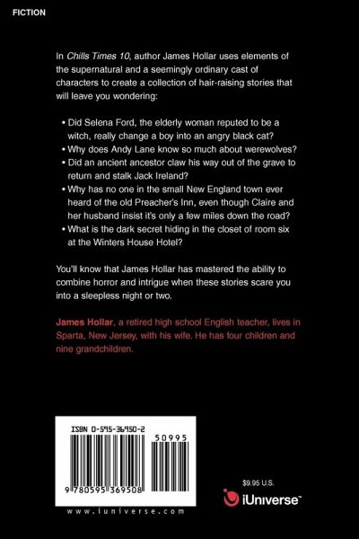 InChills Times 10, author James Hollar uses elements of the supernatural and a seemingly ordinary cast of characters to create a collection of hair-raising stories that will leave you wondering: Did Selena Ford, the elderly woman reputed to be a witch, really change a boy into an angry black cat? Why does Andy Lane know so much about werewolves? Did an ancient ancestor claw his way out of the grave to return and stalk Jack Ireland? Why has no one in the small New England town ever heard of the old Preacher's Inn, even though Claire and her husband insist it's only a few miles down the road? What is the dark secret hiding in the closet of room six at the Winters House Hotel? You'll know that James Hollar has mastered the ability to combine horror and intrigue when these stories scare you into a sleepless night or two.