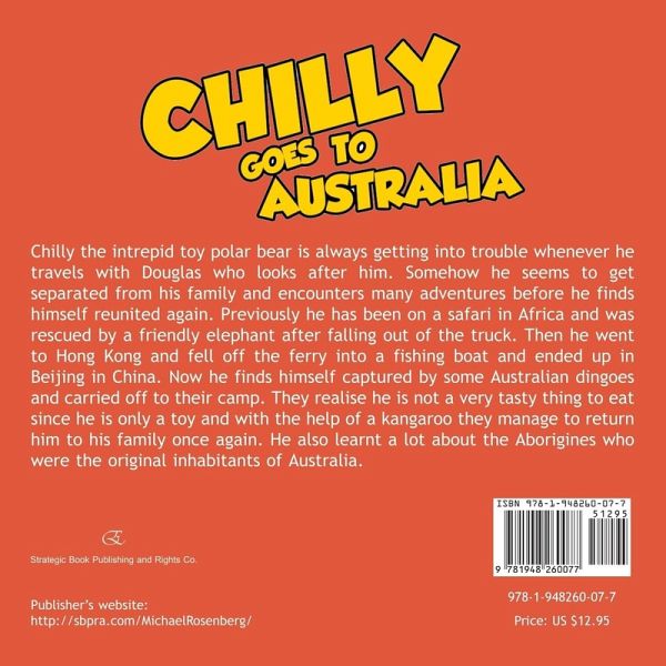 Chilly the intrepid toy polar bear is always getting into trouble whenever he travels with Douglas who looks after him. Somehow he seems to get separated from his family and encounters many adventures before he finds himself reunited again. Previously he has been on a safari in Africa and was rescued by a friendly elephant after falling out of the truck. Then he went to Hong Kong and fell off the ferry into a fishing boat and ended up in Beijing in China. Now he finds himself captured by some Australian dingoes and carried off to their camp. They realise he is not a very tasty thing to eat since he is only a toy and with the help of a kangaroo they manage to return him to his family once again. He also learnt a lot about the Aborigines who were the original inhabitants of Australia.
