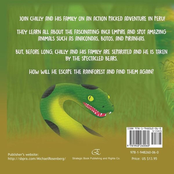 Join Chilly and his family on an action packed adventure in Peru! They learn all about the fascinating Inca Empire and spot amazing animals such as anacondas, botos, and piranhas. But, before long, Chilly and his family are separated and he is taken by the spectacled bears. How will he escape the rainforest and find them again? Publisher's website: http://sbpra.com/MichaelRosenberg