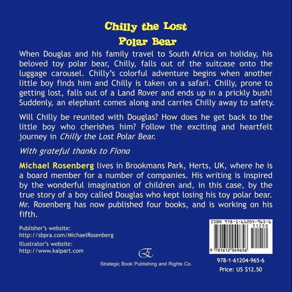 When Douglas and his family travel to South Africa on holiday, his beloved toy polar bear, Chilly, falls out of the suitcase onto the luggage carousel. Chilly's colorful adventure begins when another little boy finds him and Chilly is taken on a safari. Chilly, prone to getting lost, falls out of a Land Rover and ends up in a prickly bush! Suddenly, an elephant comes along and carries Chilly away to safety. Will Chilly be reunited with Douglas? How does he get back to the little boy who cherishes him? Follow the exciting and heartfelt journey in Chilly the Lost Polar Bear. With grateful thanks to Fiona Michael Rosenberg lives in Brookmans Park, Herts, UK, where he is a board member for a number of companies. His writing is inspired by the wonderful imagination of children and, in this case, by the true story of a boy called Douglas who kept losing his toy polar bear. Mr. Rosenberg has now published four books, and is working on his fifth. Publisher's website: http://sbpra.com/MichaelRosenberg