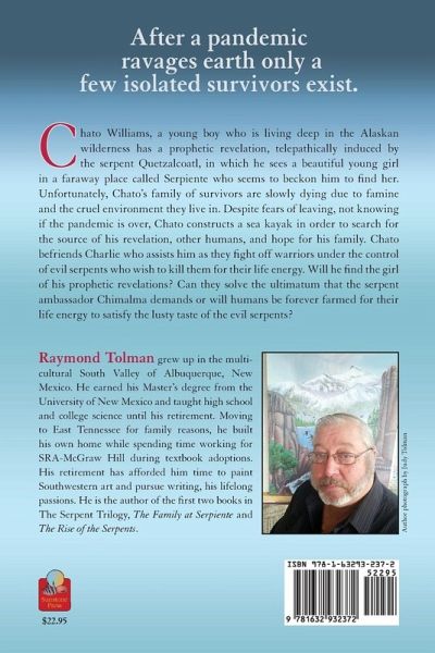 After a pandemic ravages earth only a few isolated survivors exist. Chato Williams, a young boy who is living deep in the Alaskan wilderness has a prophetic revelation, telepathically induced by the serpent Quetzalcoatl, in which he sees a beautiful young girl in a faraway place called Serpiente who seems to beckon him to find her. Unfortunately, Chato’s family of survivors are slowly dying due to famine and the cruel environment they live in. Despite fears of leaving, not knowing if the pandemic is over, Chato constructs a sea kayak in order to search for the source of his revelation, other humans, and hope for his family. Chato befriends Charlie who assists him as they fight off warriors under the control of evil serpents who wish to kill them for their life energy. Will he find the girl of his prophetic revelations? Can they solve the ultimatum that the serpent ambassador Chimalma demands or will humans be forever farmed for their life energy to satisfy the lusty taste of the evil serpents?