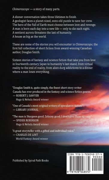 Sunburst Award Finalist Aurora Award Finalist CBC Bookies Award Finalist Chimerascope [ki-meer-uh-skohp]-a story of many parts... A young artist hungers to draw you. A dinner conversation takes three lifetimes to finish. A geologist faces a planet-sized, eons-old puzzle to save her crew. The hero of the Fall of Earth must choose between love and revenge. A mysterious dancer leads a businessman to a most exclusive nightclub. A man is born each day into a new life-only to die each night. A sentient aurora threatens the last of humanity. A Norse god's bar in Toronto hosts an unplanned family reunion. A woman descends into insanity-or is it the end of the world? A house as big as the world. Chimerascope is the first full collection of short fiction from multi-award winning author Douglas Smith, containing sixteen of his best stories, including an award winner, a Best New Horror selection, and eight award finalists. Sixteen stories of fantasy and science fiction that take you from love in fourteenth-century Japan to humanity's last stand, from virtual reality to the end of reality, from alien drug addictions to a dinner where a man loses everything. Chimerascope includes the following stories: Scream Angel The Red Bird By Her Hand, She Draws You Down New Year's Eve Out of the Light State of Disorder The Boys Are Back in Town Symphony Enlightenment Nothing Jigsaw Going Harvey in the Big House The Last Ride The Dancer at the Red Door A Taste Sweet and Salty Memories of the Dead Man