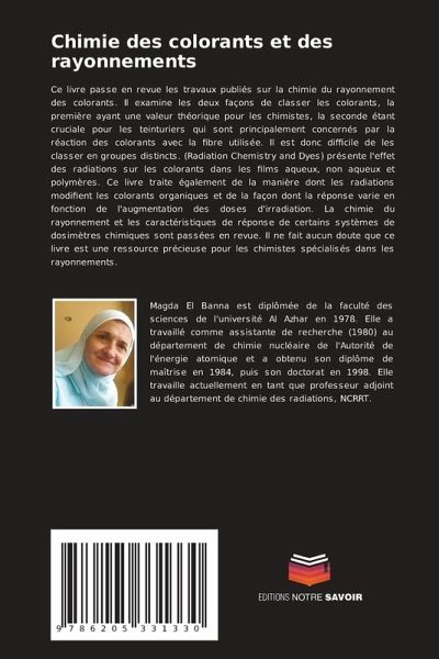 Ce livre passe en revue les travaux publiés sur la chimie du rayonnement des colorants. Il examine les deux façons de classer les colorants, la première ayant une valeur théorique pour les chimistes, la seconde étant cruciale pour les teinturiers qui sont principalement concernés par la réaction des colorants avec la fibre utilisée. Il est donc difficile de les classer en groupes distincts. (Radiation Chemistry and Dyes) présente l'effet des radiations sur les colorants dans les films aqueux, non aqueux et polymères. Ce livre traite également de la manière dont les radiations modifient les colorants organiques et de la façon dont la réponse varie en fonction de l'augmentation des doses d'irradiation. La chimie du rayonnement et les caractéristiques de réponse de certains systèmes de dosimètres chimiques sont passées en revue. Il ne fait aucun doute que ce livre est une ressource précieuse pour les chimistes spécialisés dans les rayonnements.
