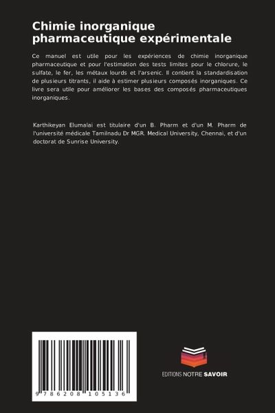 Ce manuel est utile pour les expériences de chimie inorganique pharmaceutique et pour l'estimation des tests limites pour le chlorure, le sulfate, le fer, les métaux lourds et l'arsenic. Il contient la standardisation de plusieurs titrants, il aide à estimer plusieurs composés inorganiques. Ce livre sera utile pour améliorer les bases des composés pharmaceutiques inorganiques.