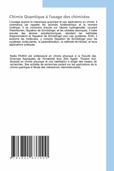 L'ouvrage explore la mécanique quantique et ses applications en chimie. Il commence par rappeler les axiomes fondamentaux et le moment cinétique. Il se concentre ensuite sur l'atome hydrogénoïde, couvrant l'Hamiltonien, l'équation de Schrödinger, et les orbitales atomiques. Il traite ensuite des atomes polyélectroniques, abordant les méthodes d'approximation et l'équation de Schrödinger pour ces systèmes. Enfin, il examine les molécules, y compris l'équation de Schrödinger pour les systèmes moléculaires, la paramétrisation, la méthode de Hückel, et leurs applications pratiques.